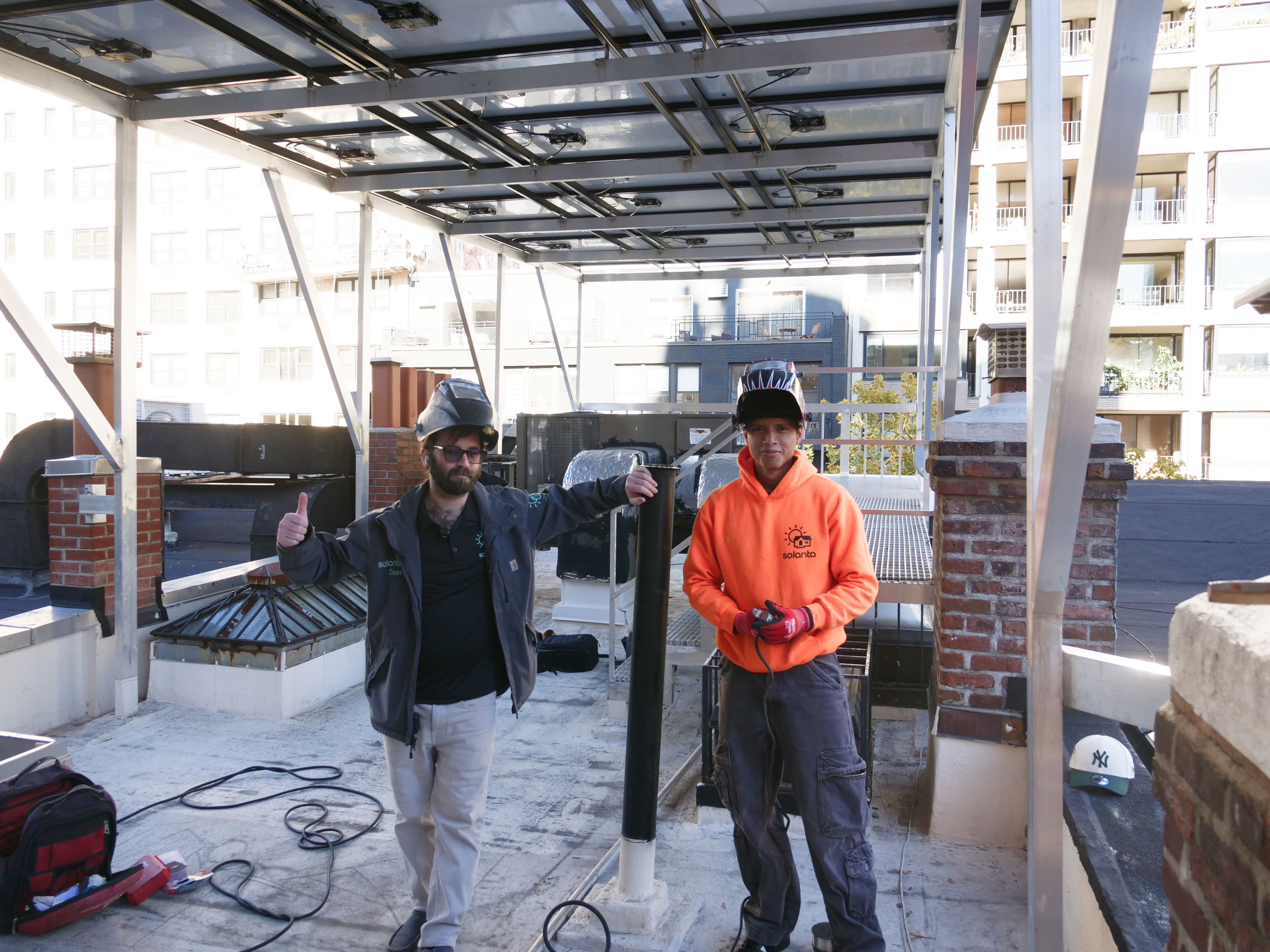 - Solar panel system installation on a house roof with visible mounting structures and equipment.